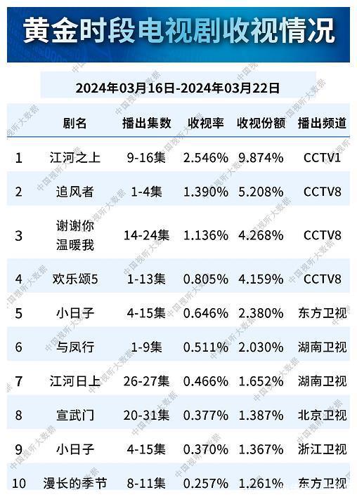 第七名,《江河日上》 主旋律题材的剧集与其他类型的作品不同,受众群体尽头踏实。 这部由黄志忠,梅婷,姜武,张国强等一众实力派戏骨主演的《江河日上》,天然收视收获没能插足前哨,但也拿下了0.4%的收视率。